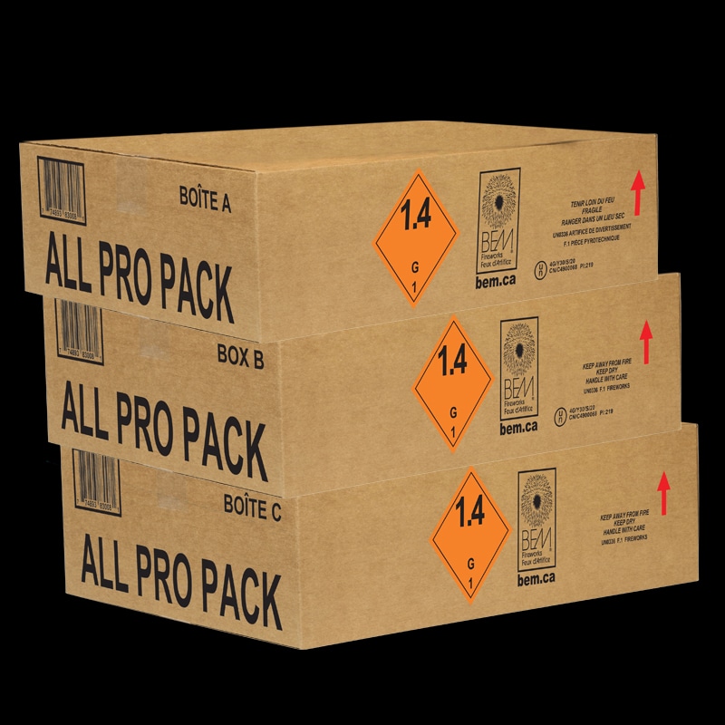 ALL PRO PACK A-B & C – Assortiment de feux d’artifice dans un emballage fermé conforme aux nouvelles normes de la DRE sur l’étalage accessible au public.