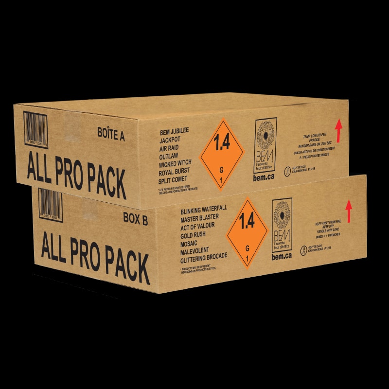 ALL PRO PACK A+B – Assortiment de feux d’artifice dans un emballage fermé conforme aux nouvelles normes de la DRE sur l’étalage accessible au public.