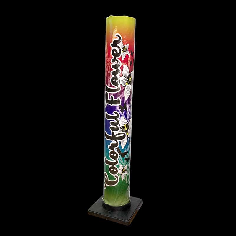 Mortier chargé d’une bombe offrant une ouverture florale colorée.